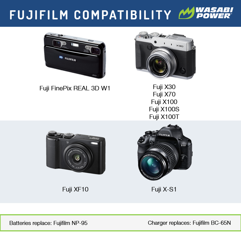 The Wasabi Power NP95 battery replaces the Fuji NP-95 battery pack. This battery features 2200mAh which provides a longer run-time between charges. It is made with premium grade-a cells to provide maximum battery life and also comes with a 3-year manufacturer warranty. Additionally, the Wasabi Power NP95 is completely compatible with all Fuji original equipment including the Fuji charger.