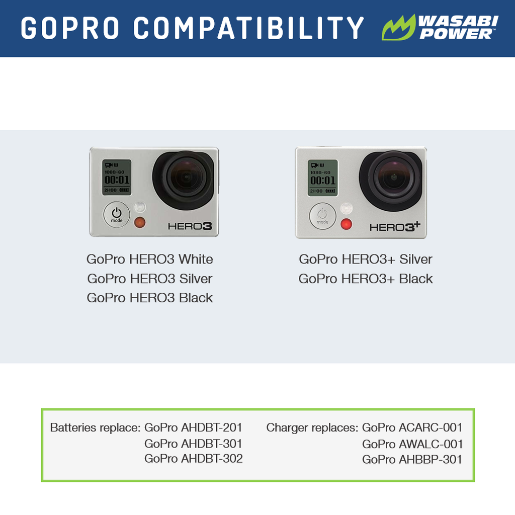 SKU: WSB-KIT-BB-AHDBT302This Wasabi Power battery and charger kit includes 2 batteries and a dual USB charger with micro-USB cord for the Hero3 or Hero3+. All items meet or exceed OEM standards and come with a 3-year manufacturer warranty.