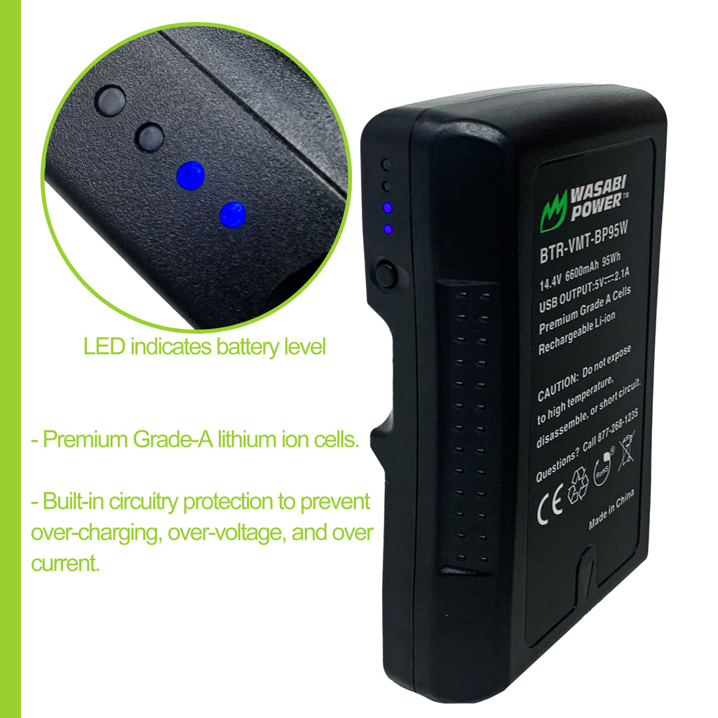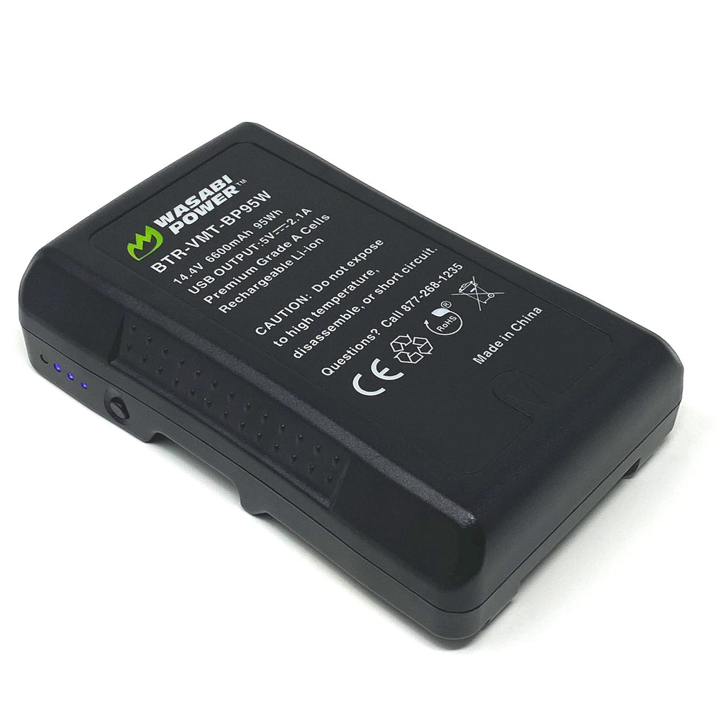 SKU: WSB-BTR-VMT-BP95WThe Wasabi Power V-mount series offers unparalleled performance and value for your professional camcorder. With premium Grade-A lithium-ion cells, this V-Mount battery features 14.4V, 6600mAh, 95Wh and zero memory effect. Also includes D-Tap and USB connections for auxiliary devices and four-LED power display to check remaining power. Built-in circuitry protection made to prevent over-charging, over-voltage, and over-current. Includes BP95W (6600mAh) battery with 3-year Wasabi Power warranty.