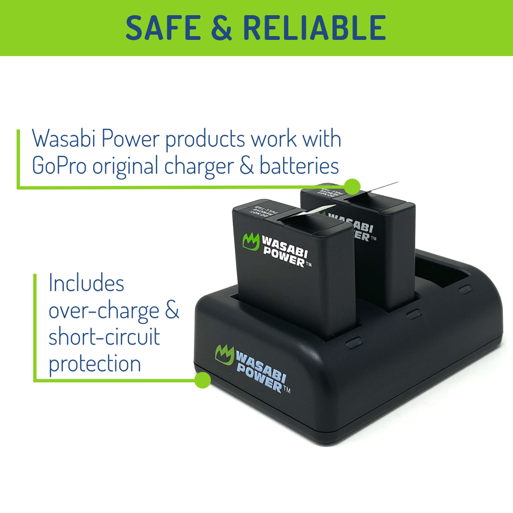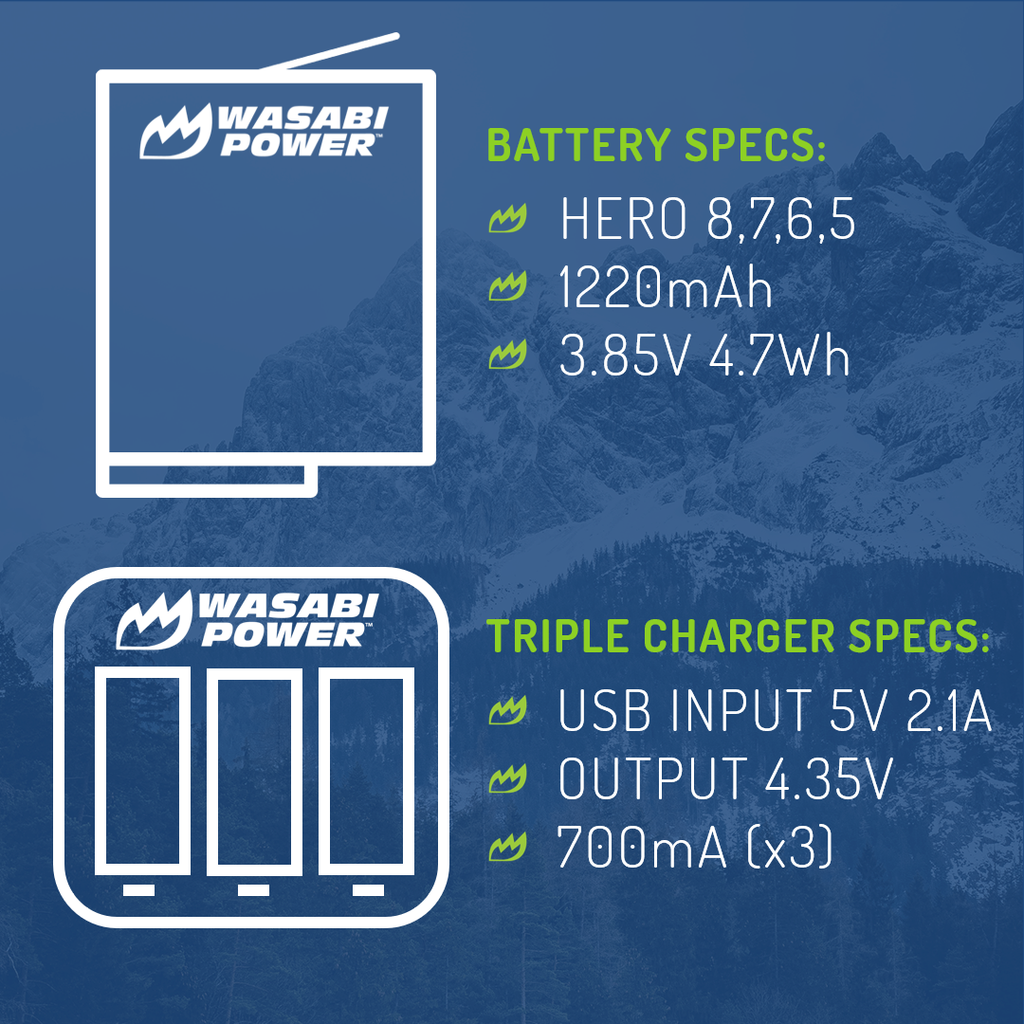 SKU: WSB-KIT-TC-HERO8Get Wasabi Power for your GoPro HERO 8 Black, HERO 7 Black, HERO 6 Black, HERO 5 Black and HERO camera (2018 model). Featuring 1220mAh, premium grade-A cells, and a 3-year Wasabi Power warranty, this battery works great as a spare or replacement. The Wasabi Power battery is completely compatible with all original equipment including the charger and camera. Includes 2 batteries and triple USB charger with micro USB and USB Type-C Ports. Need GoPro accessories? Buy a GoPro battery and GoPro charger Wasabi Power product. They're a great replacement!