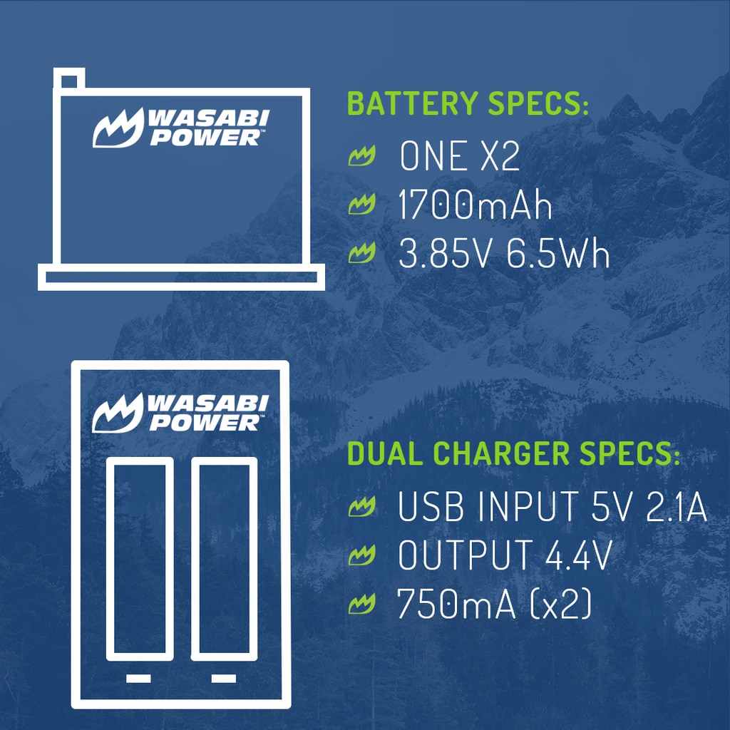 SKU: WSB-KIT-DC-ONE-X2Get Wasabi Power for your Insta360 ONE X2. Featuring 1700mAh, premium grade-A cells, and a 3-year Wasabi Power warranty, this battery works great as a spare or replacement. The Wasabi Power battery is completely compatible with all original equipment including the charger and camera. The battery is not waterproof. Includes 2 batteries and dual USB charger with micro USB and USB Type-C Ports. Need Insta360 accessories? Buy a ONEX2 battery and ONEX2 charger Wasabi Power product. They're a great replacement!