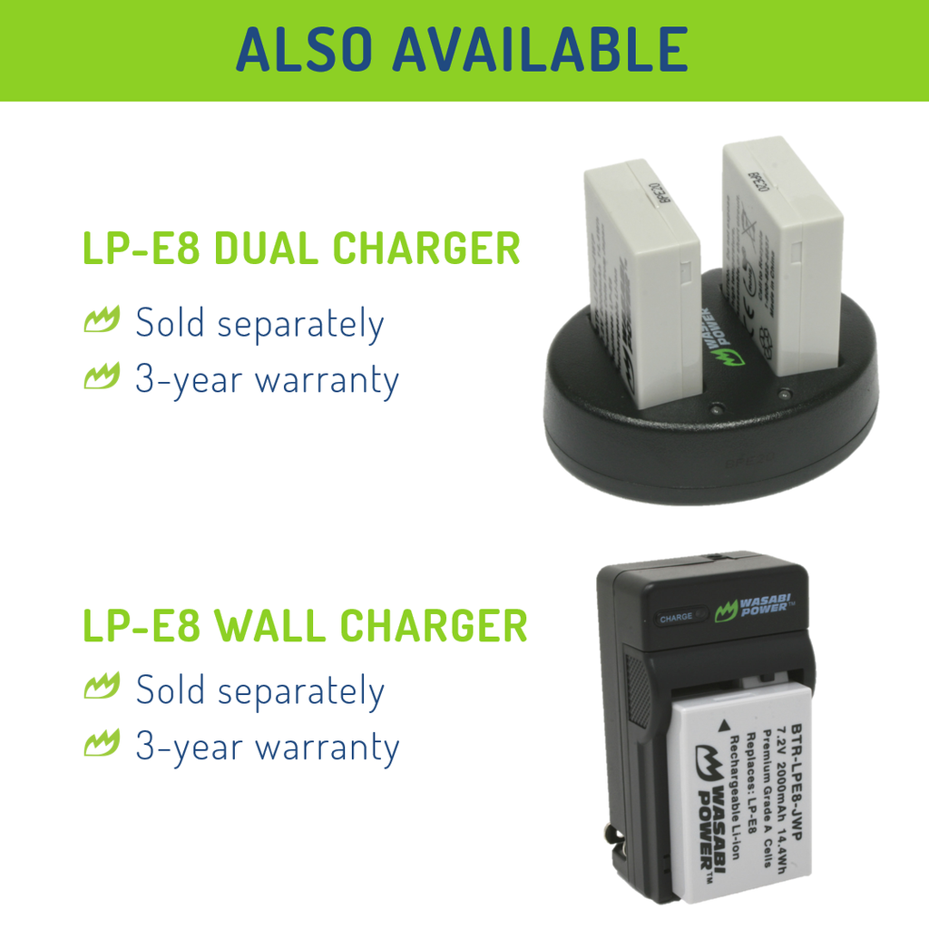 The Wasabi Power LPE8 battery replaces the Canon LP-E8 battery pack. This battery features 2000mAh which provides a longer run-time between charges. It is made with premium Grade A cells to provide maximum battery life and also comes with a 3-year manufacturer warranty. Additionally, the Wasabi Power LPE8 is completely compatible with all Canon original equipment including the Canon charger.