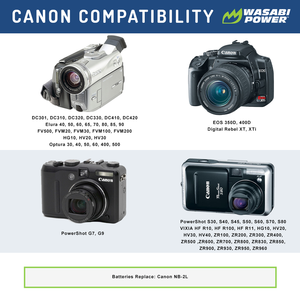 SKU: WSB-BTR-NB2LThis Wasabi Power battery replaces the Canon NB-2L battery pack. It is compatible with many Canon camera and camcorder models. It meets or exceeds OEM standards.