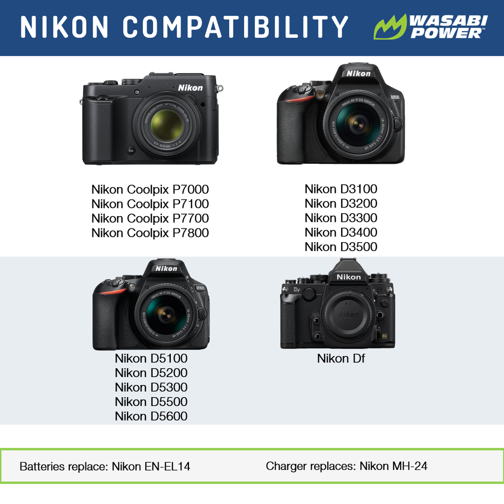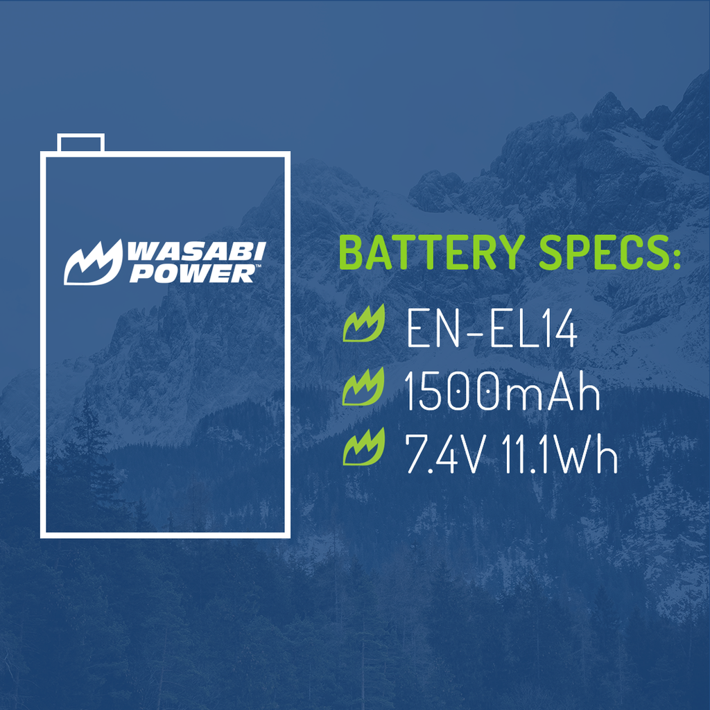 The Wasabi Power ENEL14 battery replaces the Nikon EN-EL14 or EN-EL14a battery. These batteries are fully decoded, which means that they will perform like the Nikon original, displaying the remaining battery life on the camera. They are fully compatible with the Nikon camera and charger. All items meet or exceed OEM standards and come with a 3-year manufacturer warranty.