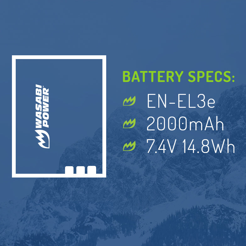 SKU: WSB-BTR-ENEL3eThis Wasabi Power battery replaces the Nikon EN-EL3e digital camera battery. It is compatible with select Nikon D Series SLR digital cameras. It meets or exceeds OEM standards.