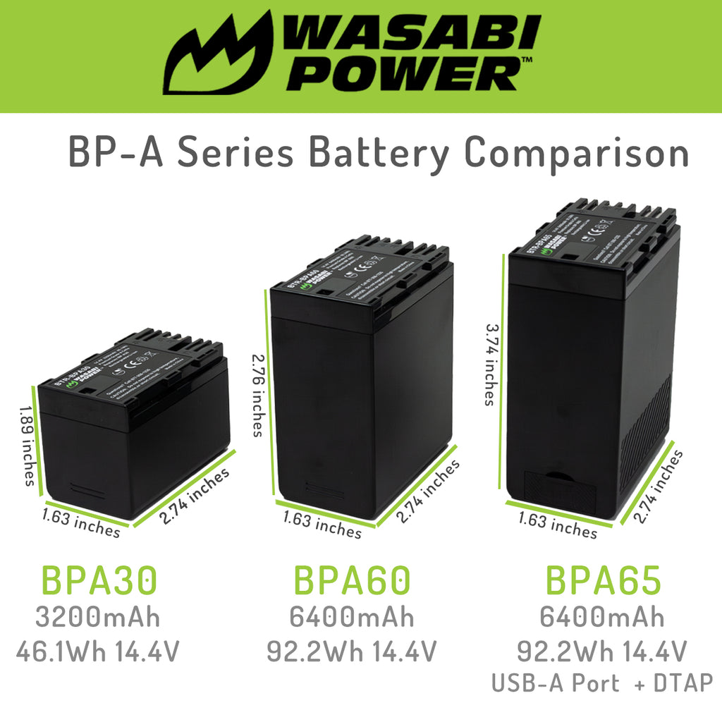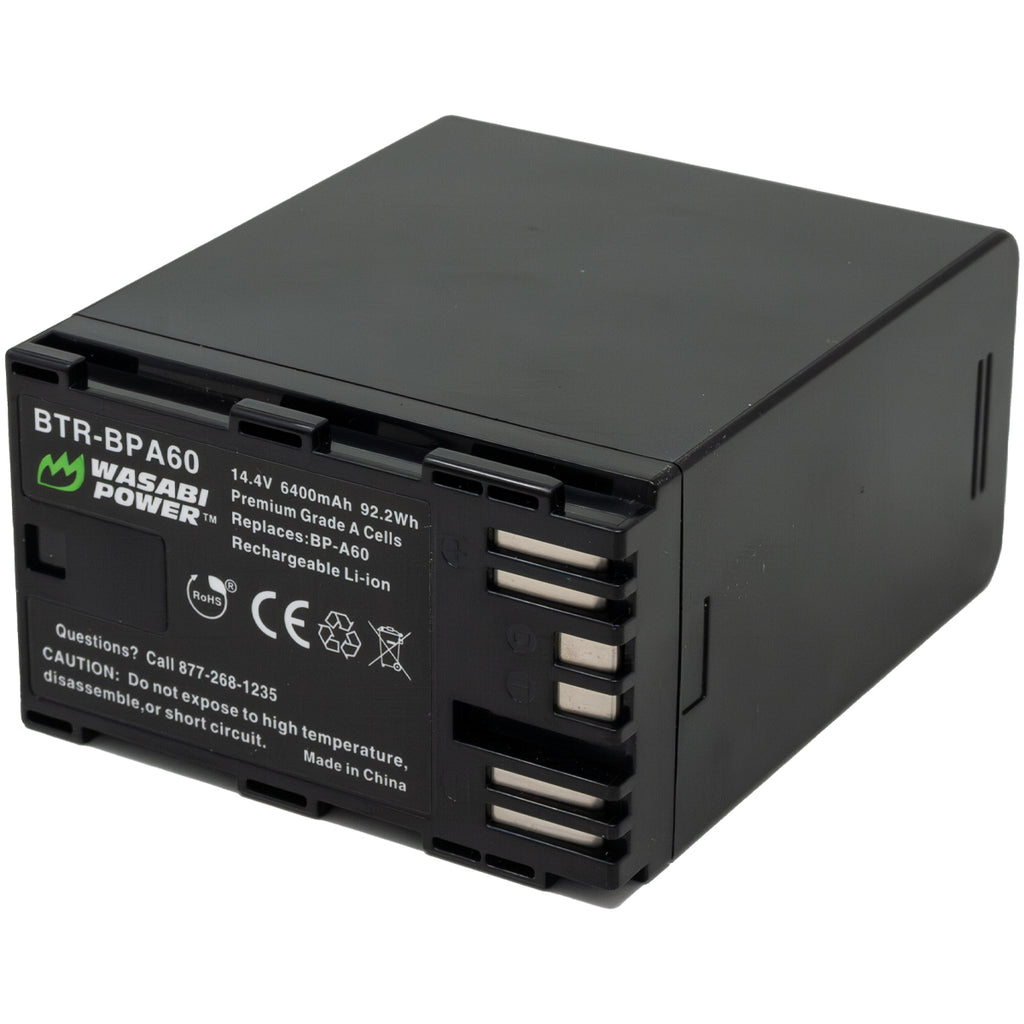 SKU: WSB-BTR-BPA60This Wasabi Power battery replaces the Canon BP-A60 battery pack. This battery features 6400mAh which provides a longer run-time between charges. It is made with premium grade-a cells to provide maximum battery life and also comes with a 3-year manufacturer warranty. Additionally, the Wasabi Power battery is completely compatible with all Canon original equipment including the charger and camera.