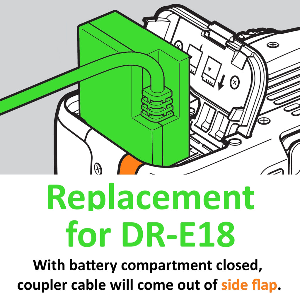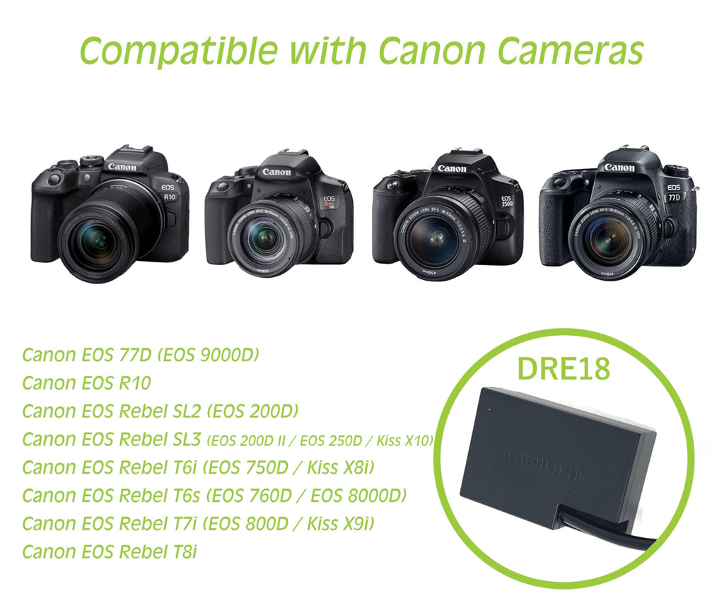 SKU: WSB-DCC-LPE17-DTAPCOMPATIBILITY - This dummy battery replaces the Canon LP-E17 and works for Canon EOS 77D, R10, SL2, SL3, T6i, T6s, T7i, T8i. (NOTE: Please verify your camera uses a Canon LP-E17 battery and has the correct battery cover with cable hole)