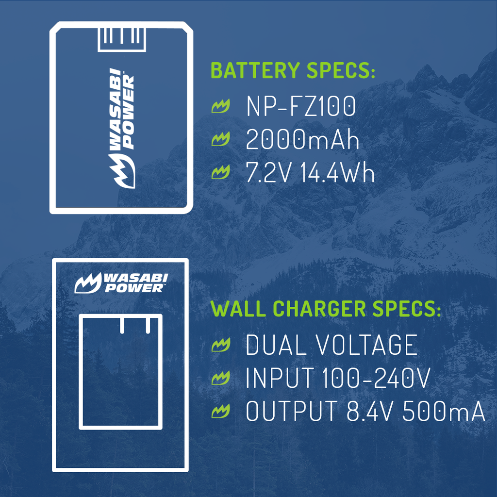 This Wasabi Power battery replaces the Sony NP-FZ100 battery or NPFZ100 Z-series rechargeable battery pack. All items meet or exceed OEM standards and come with a 3-year manufacturer warranty. Battery Voltage: 7.2V Battery Capacity: 2000mAh for longer battery life (run-time) Battery Cells: Premium Grade A Cells for longer battery lifespan (number of recharge cycles) Battery Compatibility: Fully-decoded to display remaining charge; works with Sony original camera and Sony charger 3-year manufacturer warranty from Wasabi Power.