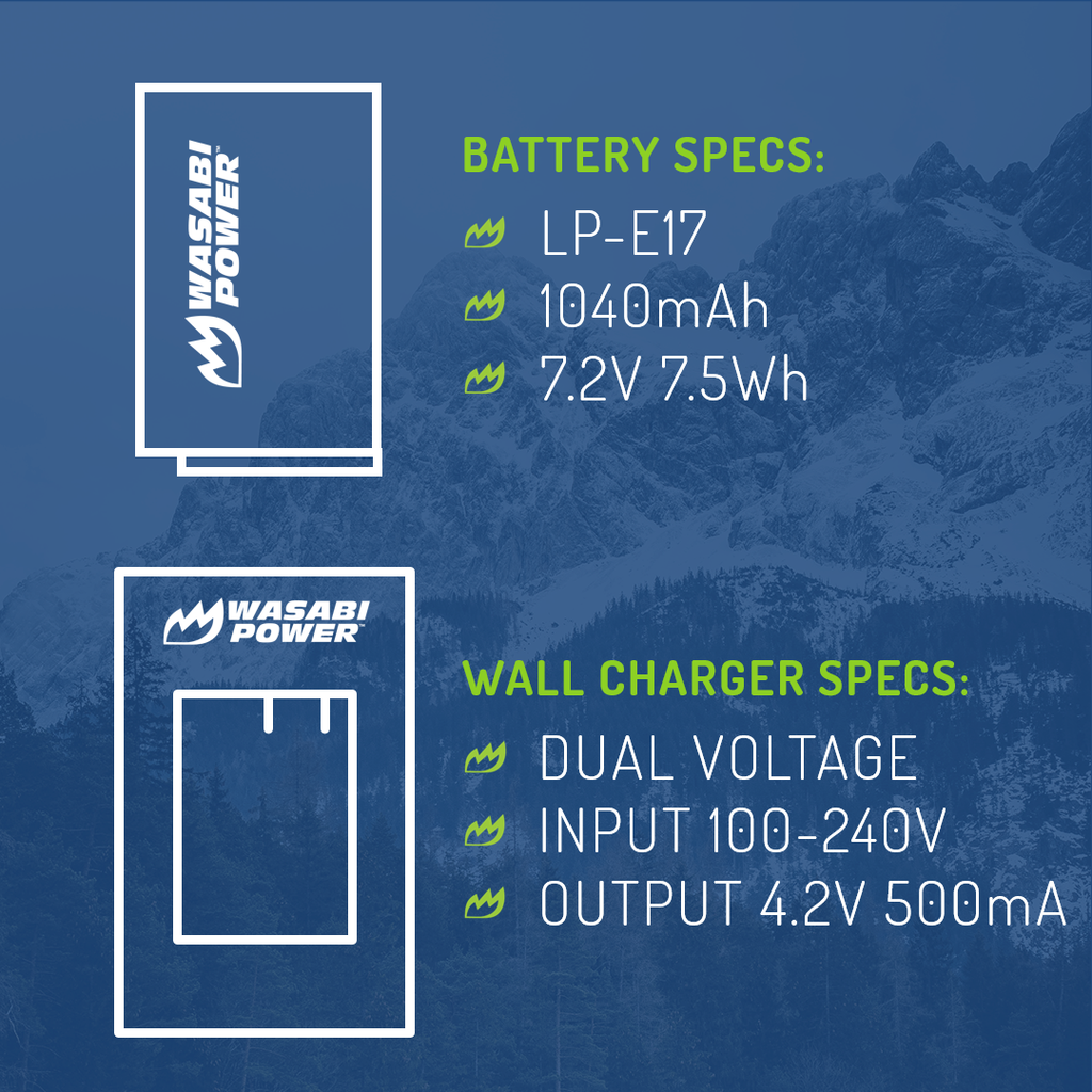 SKU: WSB-KIT-BTR-LPE17-LCH-LPE17This Wasabi Power battery and charger kit includes 2 batteries for the Canon LP-E17 and one US charger with a 12V car adapter and European adapter. All items meet or exceed OEM standards and come with a 3-year manufacturer warranty. Need a Canon LP-E17 battery pack for your Canon EOS RP or Canon M6? Wasabi Power is a great replacement for a Canon EOS RP battery or EOS M6 battery.