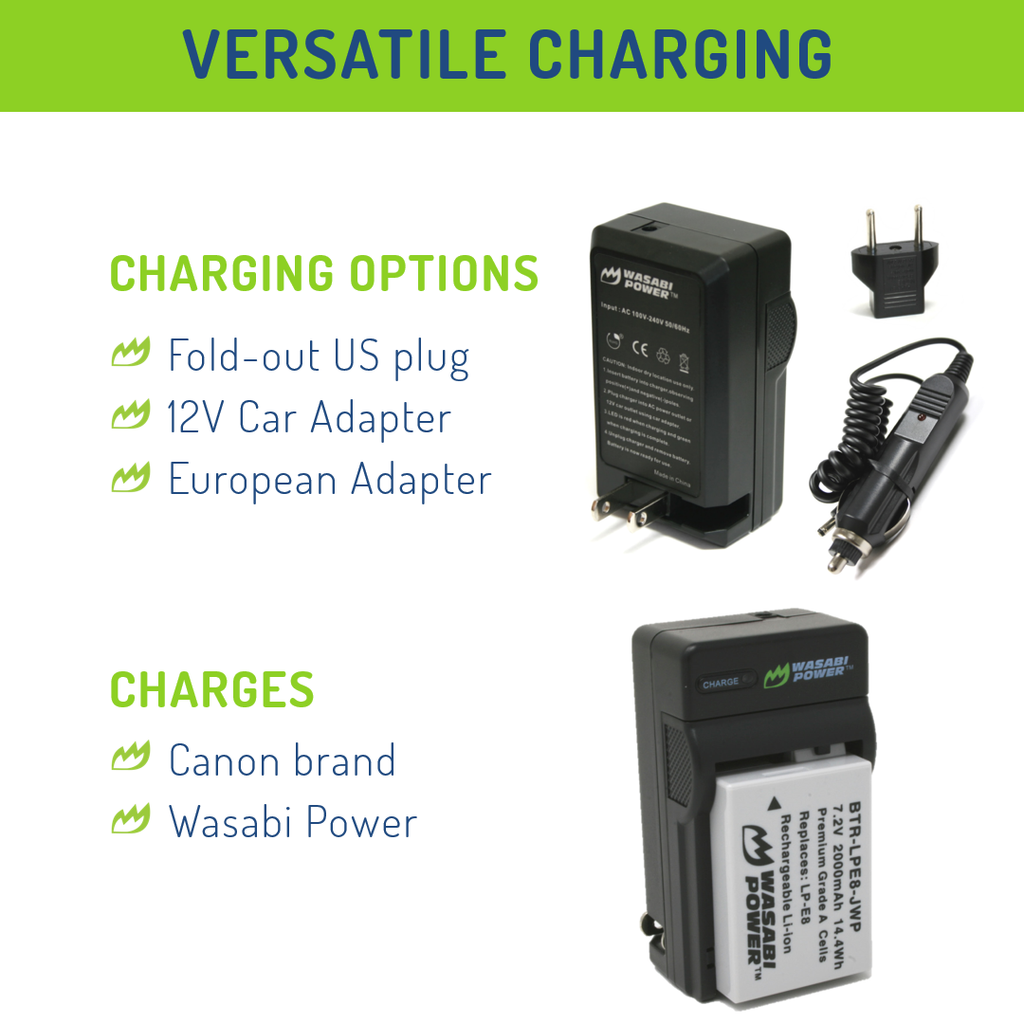 The Wasabi Power LPE8 battery and charger kit includes 2 batteries and one charger with a European plug and car adapter. All items meet or exceed OEM standards and come with a 3-year manufacturer warranty.