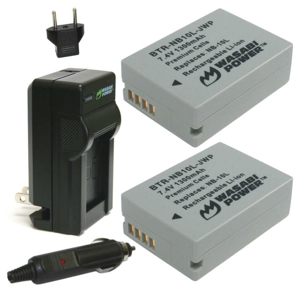 The Wasabi Power NB10L Kit includes: 2 Hi-Capacity batteries with premium grade-a cells, 1 mini rapid charger (110/240V) with fold-out AC prongs, Car adapter to charge from your vehicle's DC/lighter outlet, European plug adapter for travel. All items meet or exceed OEM standards and come with a 3-year manufacturer warranty.