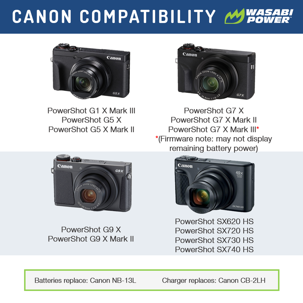 SKU: WSB-KIT-BTR-NB13L-LCH-NB12LThis Wasabi Power battery and charger kit includes 2 batteries for the Canon NB-13L and one US charger with a 12V car adapter and European adapter. All items meet or exceed OEM standards and come with a 3-year manufacturer warranty. Need a Canon G7X battery? A Wasabi Power replacement for the Cannon camera battery NB-13L is the perfect fit.