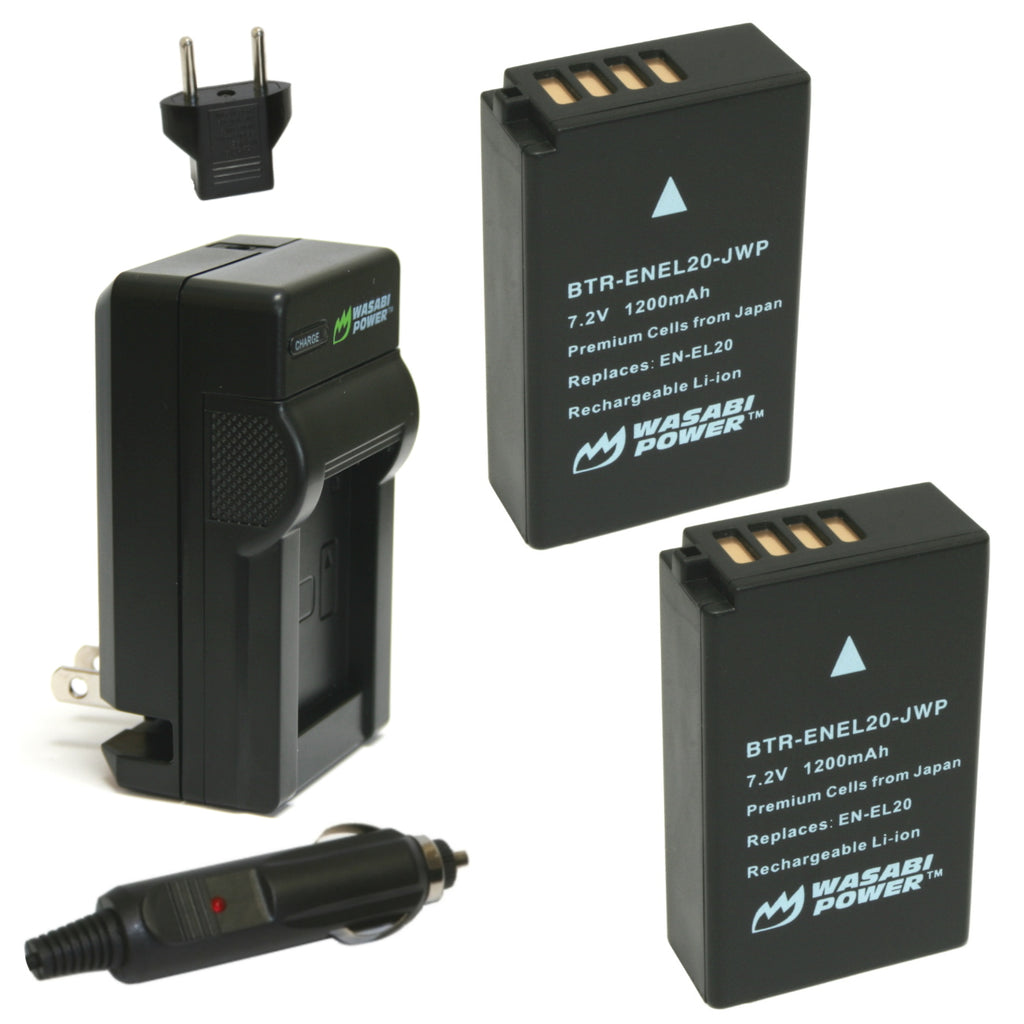 SKU: WSB-KIT-BTR-ENEL20-LCH-ENEL20The Wasabi Power ENEL20 Kit includes: 2 Hi-Capacity batteries with premium grade A cells, 1 mini rapid charger (110/240V) with fold-out AC prongs, Car adapter to charge from your vehicle's DC/lighter outlet, European plug adapter for travel All items meet or exceed OEM standards and come with a 3-year manufacturer warranty.