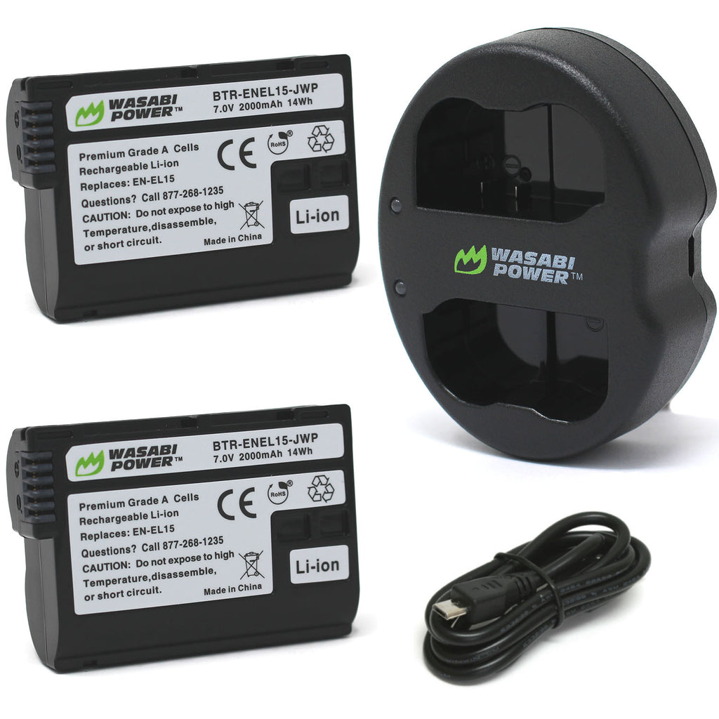 This Wasabi Power ENEL15 kit includes 2 batteries and one dual USB charger. All items meet or exceed OEM standards and come with a 3-year manufacturer warranty. Batteries replace Nikon EN-EL15, EN-EL15a, EN-EL15b, EN-EL15c. Need a Nikon D850 battery? Buy a Wasabi Power Nikon battery for D850.