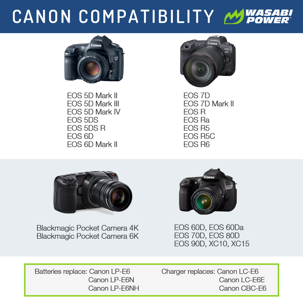 SKU: WSB-BTR-LPE6The Wasabi Power LP-E6 battery replaces the Canon LP-E6 battery pack. This battery features 2600mAh which provides a longer run-time between charges. It is made with premium grade-a cells to provide maximum battery life and also comes with a 3-year manufacturer warranty. Additionally, the Wasabi Power LP-E6 comes fully decoded, so it will display the remaining battery life and usage time and is compatible with the listed Canon cameras and chargers.