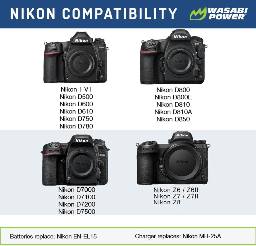 SKU: WSB-BTR-ENEL15-2PKThe Wasabi Power ENEL15 battery replaces the Nikon EN-EL15 battery pack. This battery features 2000mAh which provides a longer run-time between charges. It is made with premium grade-a cells to provide maximum battery life and also comes with a 3-year manufacturer warranty. Additionally, the Wasabi Power ENEL15 is completely compatible with all Nikon original equipment including the charger and camera. Batteries replace Nikon EN-EL15, EN-EL15a, EN-EL15b, EN-EL15c. Need a Nikon D850 battery? Buy a Wasabi Power Nikon battery for D850.