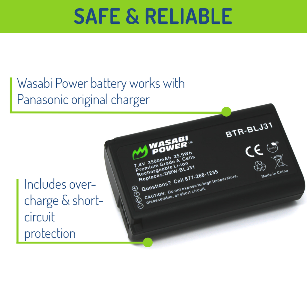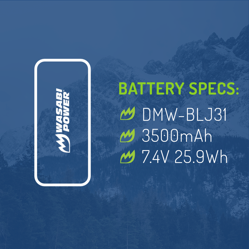 SKU: WSB-BTR-BLJ31The Wasabi Power BTR-BLJ31 battery replaces the Panasonic DMW-BLJ31 battery pack. This battery features 3500mAh which provides a longer run-time between charges. It is made with premium grade A cells to provide maximum battery life, and it comes with a 3-year manufacturer warranty. Additionally, the Wasabi Power DMW-BLJ31 is completely compatible with all Panasonic original equipment including the Panasonic charger. Need a Panasonic DMW-BLJ31 battery pack? Grab a Wasabi Power BLJ31 battery for your Lumix DC-S1H today!