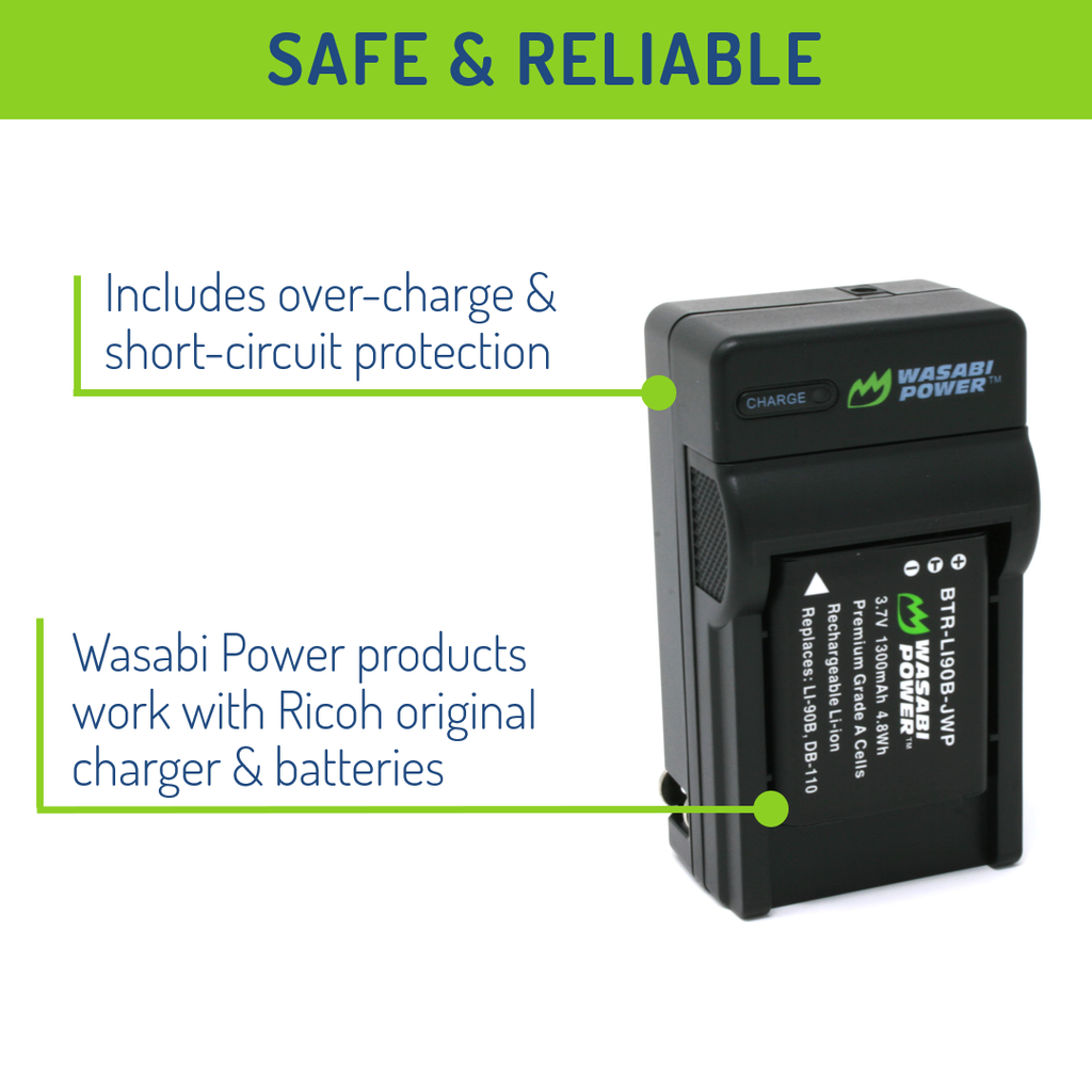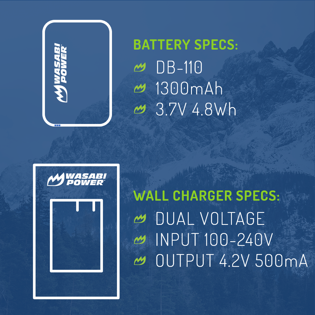 SKU: WSB-BTR-DB110The Wasabi Power DB-110 battery replaces the Ricoh DB-110. The 3.7 volt battery features 1300mAh to provide a longer run-time between charges. It is made with premium cells to provide maximum battery life and also comes with a 3-year manufacturer warranty. Additionally, the Wasabi Power DB-110 is completely compatible with all Ricoh original equipment including the Ricoh charger.