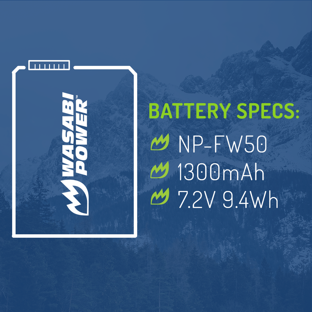 SKU: WSB-BTR-FW50-2PKThe Wasabi Power FW50 battery replaces the Sony NP-FW50 battery. It features 1300mAh to provide a longer run-time between charges. It is made with Premium Grade-A cells to provide maximum battery life. Includes 2 batteries with a 3-year manufacturer warranty. Additionally, the Wasabi Power FW50 is completely compatible with all Sony original equipment including the Sony charger. Need Sony Alpha a6500 batteries? Wasabi Power is a great replacement!
