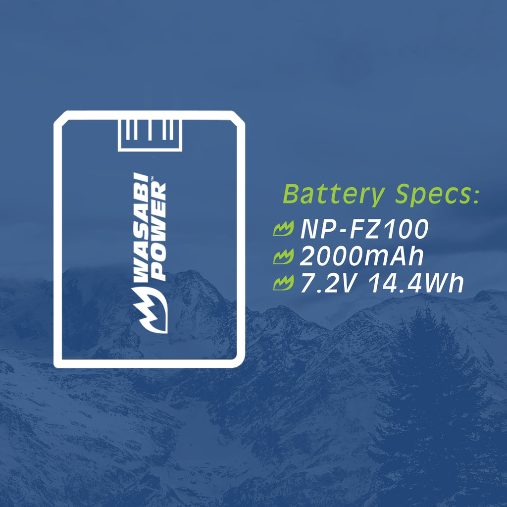 SKU: WSB-BTR-FZ100-2PKThis Wasabi Power battery replaces the Sony NP-FZ100 battery or NPFZ100 Z-series rechargeable battery pack. All items meet or exceed OEM standards and come with a 3-year manufacturer warranty. Battery Voltage: 7.2V Battery Capacity: 2000mAh for longer battery life (run-time) Battery Cells: Premium Grade A Cells for longer battery lifespan (number of recharge cycles) Battery Compatibility: Fully-decoded to display remaining charge; works with Sony original camera and Sony charger Country of Origin: Assembled in China Warranty: 3-year manufacturer warranty from Wasabi Power.